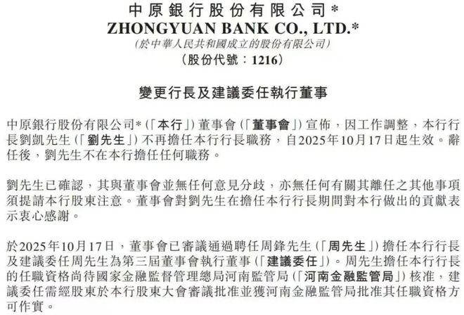 今年9月河南省委组织部的任职公示,已明确其将出任 “省管重要骨干企业正职”,10月中旬缺席总部入驻仪式的前任行长刘凯,其头衔早在8月就已从 “行长”简化为“行领导”,这些细节都为此次人事调整埋下伏笔。