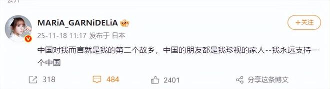 11月18日,日本歌手美依礼芽发文:“中国对我而言就是我的第二个故乡,中国的朋友都是我珍视的家人--我永远支持一个中国。”