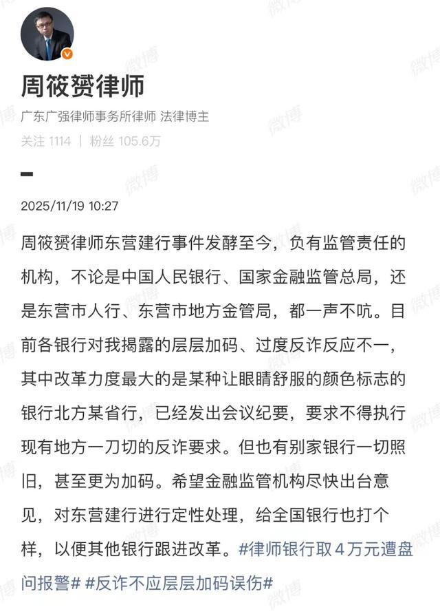 11月5日,律师周筱赟称前往建设银行山东东营支行取现,因被要求必须说明资金用途,引发网络持续关注。