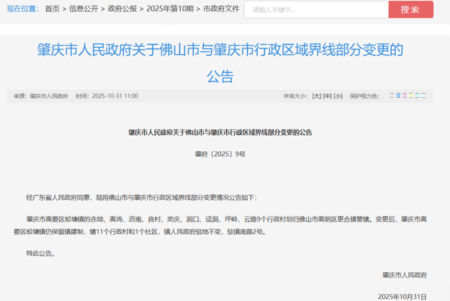 《肇庆市人民政府关于佛山市与肇庆市行政区域界线部分变更的公告》。图片来源于肇庆市人民政府官网