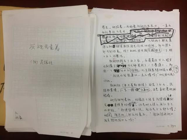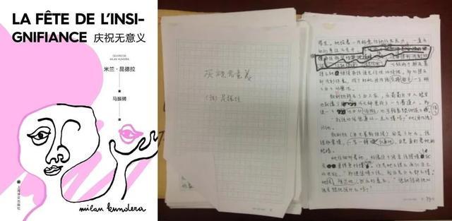 米兰·昆德拉《庆祝无意义》的翻译手稿,标有许多修改记录。