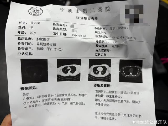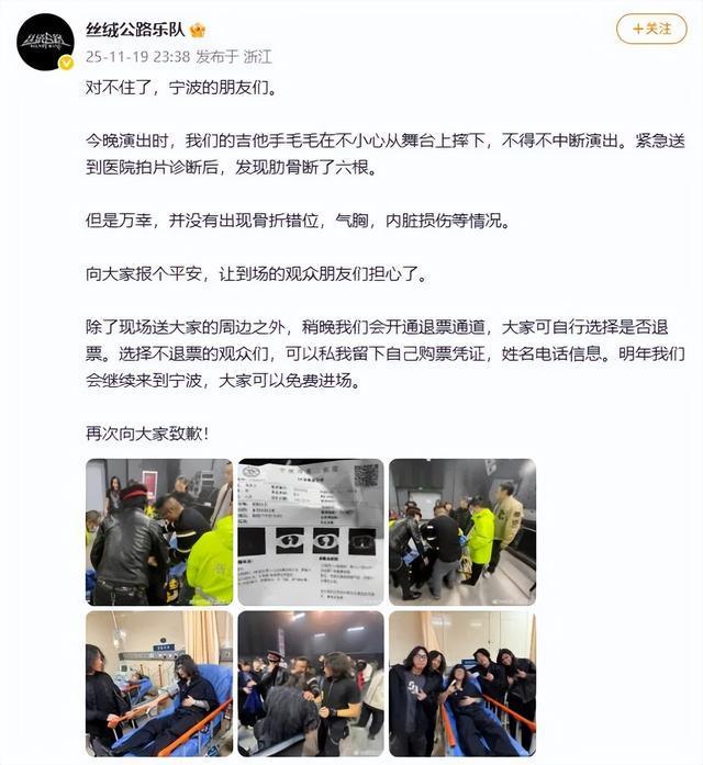 11月19日晚,@丝绒公路乐队 微博发文:当晚演出时,我们的吉他手毛毛不小心从舞台上摔下,不得不中断演出。紧急送到医院拍片诊断后,发现肋骨断了六根。