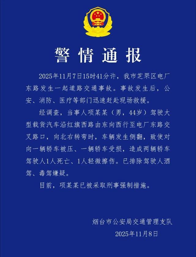 11月7日,烟台市芝罘区道路上发生一起车祸,一辆大型载货汽车在十字路口转弯时车辆侧翻,整个车身压在一辆轿车上,轿车直接被掩埋,事故造成车上驾驶员死亡。事发后,公安、消防、医疗等部门赶到现场救援。11月8日,烟台交警通报,货车司机项某某已被采取刑事强制措施。
