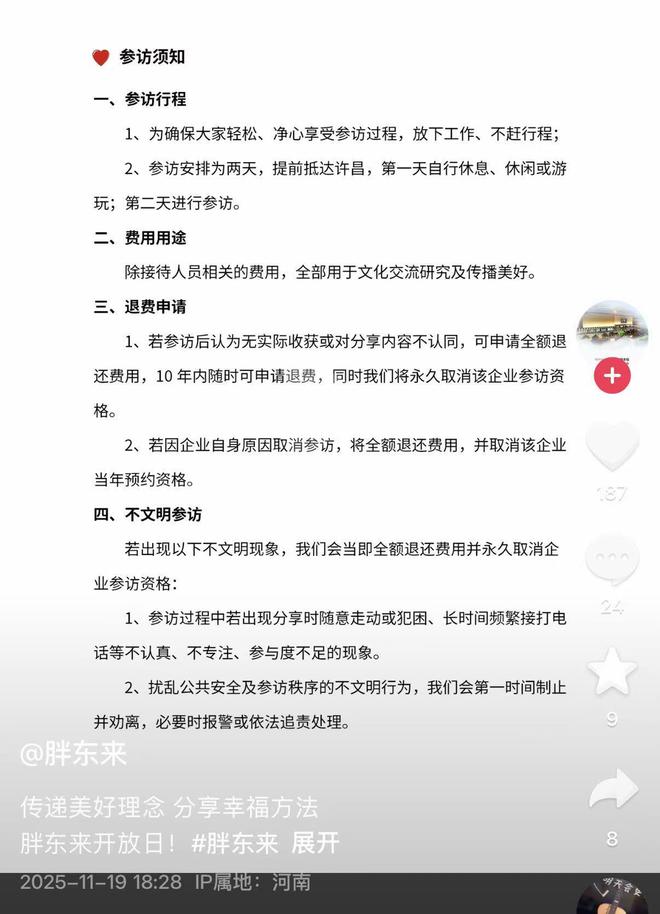 11月19日,胖东来对“胖东来开放日”活动进行了信息补充,特别提到参访人员的退费政策。如果参访企业在活动后认为没有实际收获,或者不认同分享内容,可以申请全额退还费用,且在10年内随时可提出申请,但胖东来将永久取消该企业的参访资格。若因企业自身原因取消参访,胖东来也会全额退还费用,并取消该企业当年的预约资格。