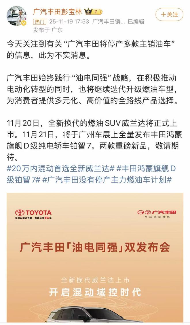 对此,广汽丰田销售副总彭宝林回应称“不实消息”。他还表示广汽丰田始终践行“油电同强”战略,11月20日全新换代的燃油SUV威兰达将正式上市。