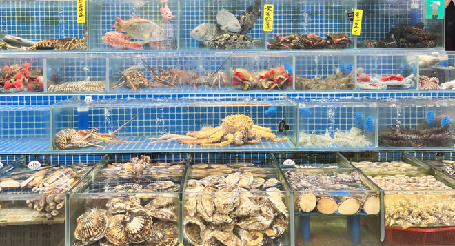 上午10点左右,这些门店大部分都已经开始营业,并外摆出了各类鲜活水产,包含虾、蟹、花螺、扇贝、象牙蚌、三文鱼等众多河鲜、海鲜。