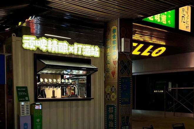 在灯光明亮、装修简约的打酒铺内,店员站在一排金属酒头前,熟练地为客人打上一杯按“两”售卖的鲜啤、果酒或白酒。没有最低消费,也没有酒吧震耳的音乐,顾客通常即打即走,或者和朋友在吧台边小坐片刻,配上一把花生米或从隔壁小店买来的卤味小吃,享受一段微醺“时刻”。