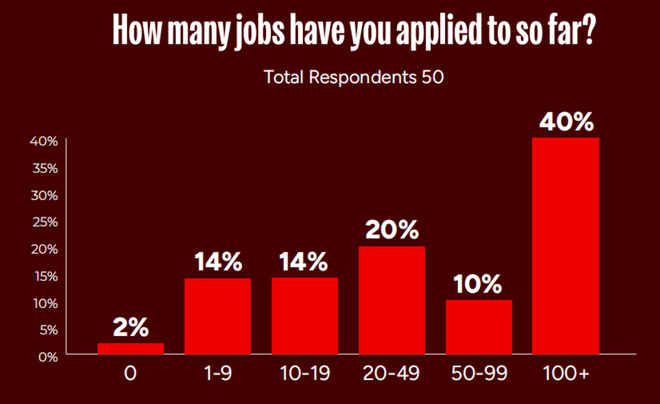 当谈及当前求职情况时,44%仍未就业的受访者表示自己每周花6-10小时在找工作;另有40%表示他们至今已提交至少100份求职申请。