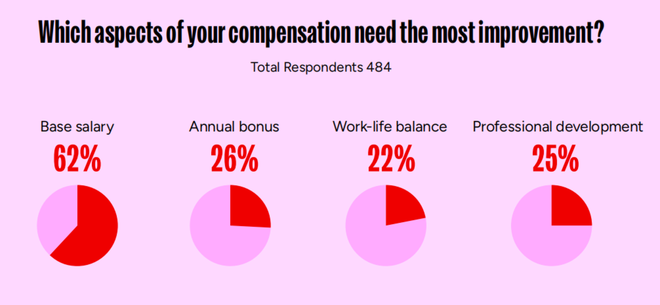 此外,60%的女性与非二元性别受访者表示自己感到薪酬偏低(相比之下男性为50%);62%的非白人从业者也表达了同样的感受(相比之下白人为50%)。