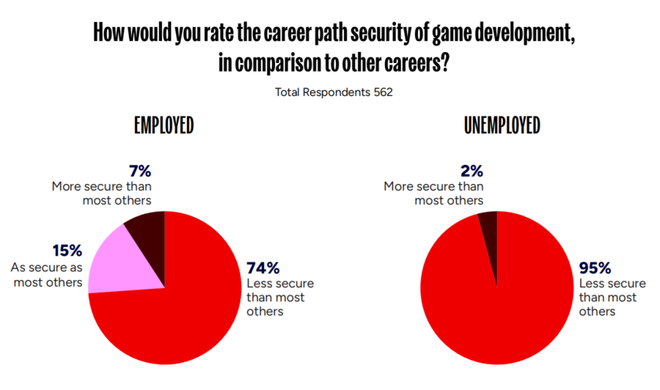 但对失业者来说,情况就显得更为悲观了。高达98%的失业受访者认为游戏行业比其他行业更加不稳定,另外有29%表示自己「不太可能」继续留在行业中(21%表示不确定)。