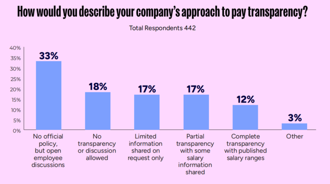 在美国,薪酬透明度是个复杂议题。联邦层面没有相关法律,但一些城市和州已经出台法规,要求雇主在新职位或晋升岗位的招聘信息中公开预期薪资范围。根据本次调查,大约29%的受访者所在公司具有某种程度的薪酬透明机制。