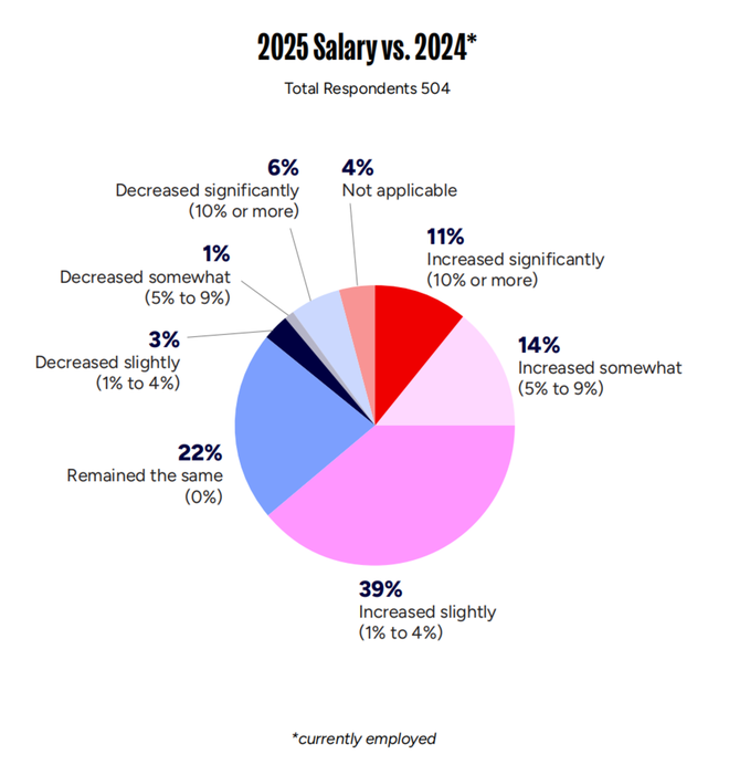 其中有39%的受访者表示,他们的薪资比起2024年「稍微上涨」,而22%的受访者表示他们的薪资水平与去年持平,有6%的受访者表示他们的薪资降幅达到10%或以上。