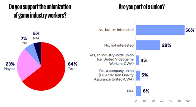 将近三分之二(64%)的受访者表示,他们支持游戏行业劳动者加入工会;其中,年轻从业者、目前处于失业状态的人员、以及年薪低于10万美元的群体支持度更高。另有一成(9%)的受访者表示自己目前已经是工会成员。
