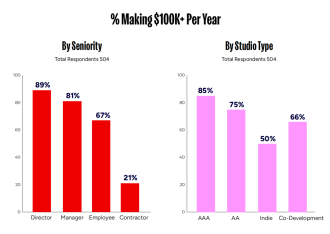 为了进一步验证这一点,我们选取了一个在整体调查中占比统计显著的群体进行比较:具有至少6年经验、目前受雇的游戏设计师(共75名受访者)。在这一子样本中,三分之二的男性(68%)的年薪至少为125K美元,而女性与非二元性别受访者中仅有38%达到这一水平。此外,62%的白人员工年薪至少为125K美元,而非白人员工中这一比例为45%。