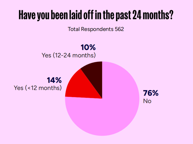 这一差异同样体现在裁员危机上。调研显示,过去两年里,28%的音频、游戏设计或视觉艺术从业者经历过被裁员;而在程序、商务或运营岗位中,这一比例为22%。整体来看,约四分之一(24%)的受访者表示,他们在过去两年中曾被裁员,而其中近一半至今仍未找到新工作。