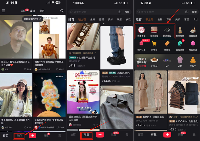 现阶段,市集内测到用户多为近期在小红书有购物行为的用户,测试版小红书 APP 底部导航栏“首页”右侧的“热门”会变成“市集”,点击进入有三大创新模块:
