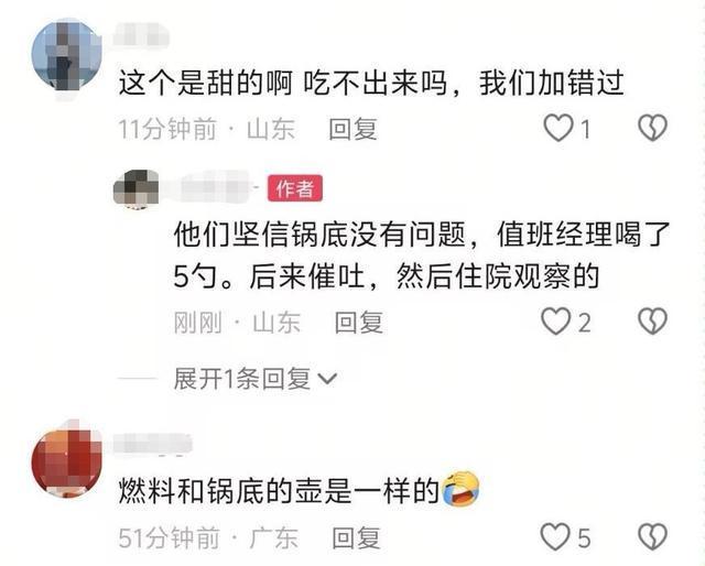23日上午,极目新闻记者联系上视频发布者,对方称自己还在县医院,未介绍更多内容。其曾在评论区回复称:他们坚信锅底没有问题,值班经理喝了5勺,后来催吐,然后住院观察。另有网友称“燃料和锅底的壶是一样的”“我们加错过”。