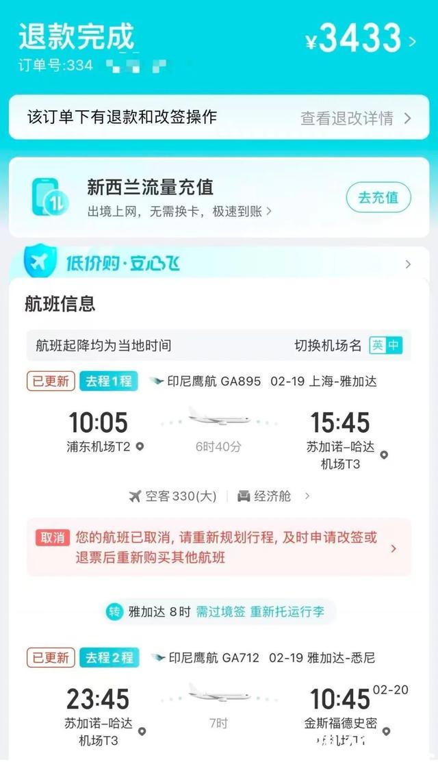 女子提前购春节新西兰往返机票遭平台单方面取消,引发涨价争议