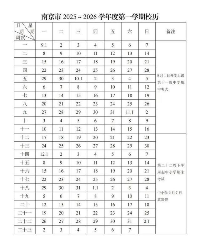 根据南京市2025~2026学年度第一学期校历,第二十二周下半周起中小学期末考试,2月7日放寒假。