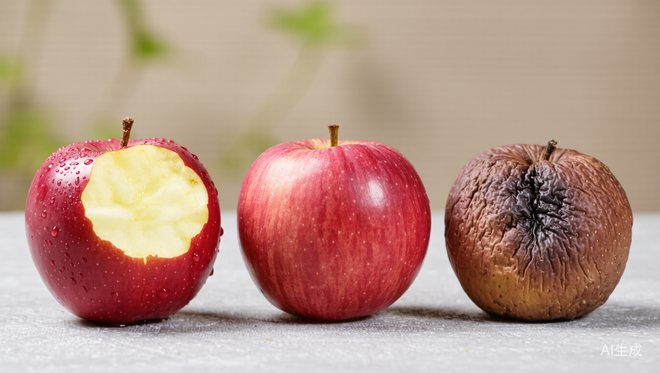 但在细节核验时往往暴露出概率生成的缺陷,中间苹果上面的水珠其排布不符合客观规律,而右边苹果的腐烂看起来又过于刻意。