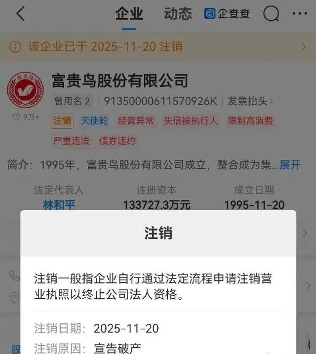 11月24日消息,天眼查APP显示,日前,富贵鸟股份有限公司(下称富贵鸟)登记状态由存续变更为注销,注销原因为宣告破产。