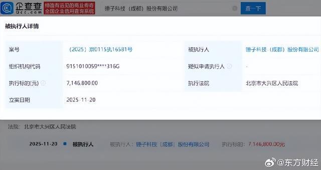 11月25日,@东方财经:企查查APP显示,11月20日,锤子科技(成都)股份有限公司新增一则被执行人信息,执行标的约715万元,执行法院为北京市大兴区人民法院。