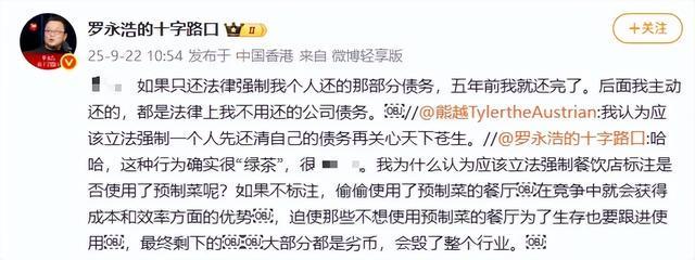 2025年9月22日,针对网友质疑的罗永浩债务问题,罗永浩本人转发微博回应。