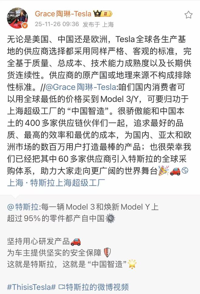 今日,特斯拉副总裁陶琳发文称:无论是美国、中国还是欧洲,特斯拉全球各生产基地的供应商选择都采用同样严格、客观的标准,完全基于质量、总成本、技术能力成熟度以及长期供货的连续性,供应商的原产国或地理来源不构成排除性标准。