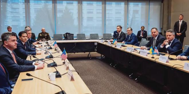 11月23日,乌克兰总统办公室主任叶尔马克(右二)、美国国务卿鲁比奥(左二)分别率领乌、美代表团在瑞士日内瓦举行会谈。