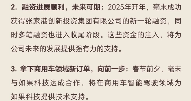 2025年开年,毫末智行董事长张凯与CEO顾维灏曾在全员内部信中表示,公司融资进展顺利,未来可期:“2025年开年毫末成功获得张家港创新投资集团有限公司的新一轮融资,同时多笔融资也进入收尾阶段。”