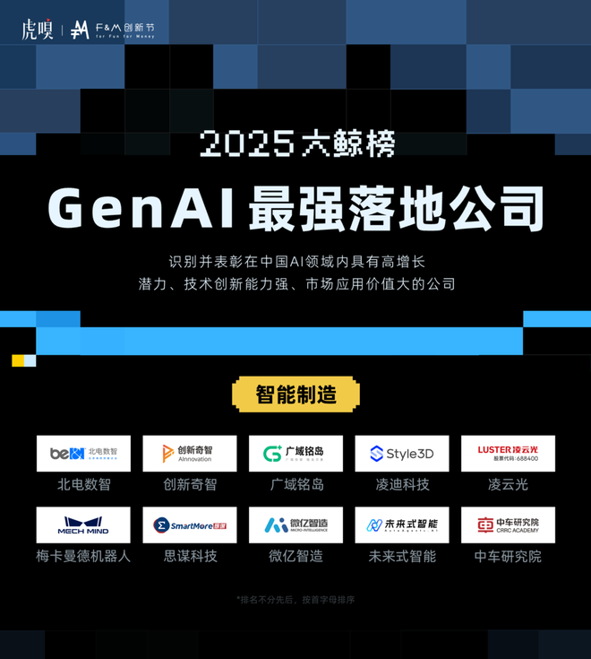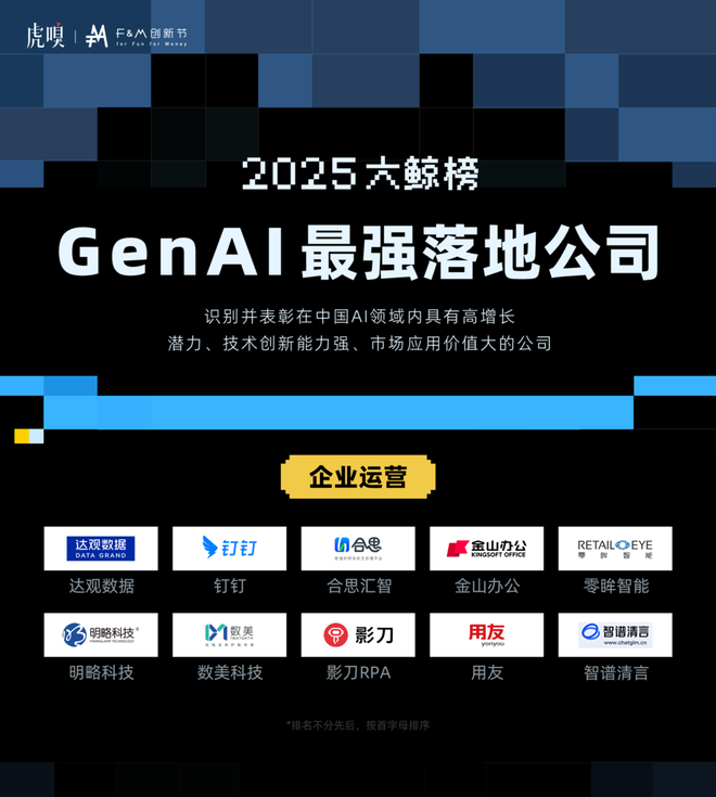在这样的背景下,由虎嗅智库发起的“2025大鲸榜·GenAI最强落地公司”评选正式揭晓。本次评选旨在穿越喧嚣,锚定那些真正将大模型泛化能力转化为规模化、可量化商业价值的“数智先锋”。
