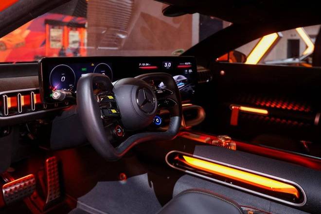 奔驰在AMG GT XX概念车的内饰上,做了更大胆的尝试。它采用了基于驾驶者体型定制的3D打印座垫,并且包覆了LABFIBER生物科技皮革材料。这也是汽车行业首次应用、兼具真皮质感/轻薄透气/防水耐用的环保材料LABFIBER生物科技皮革材料,该材料由GT3赛车的回收轮胎和生物科技材料构成。更抓人眼球的,还有接近于F1赛车既视感的方向盘。