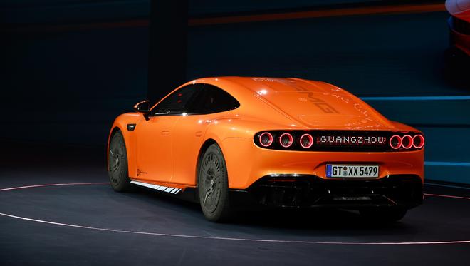 AMG GT XX概念车拥有一个非常夸张的“大嘴”,这是其空气动力学设计的一部分,与前舱盖上两个挖孔的散热口相联通。极倾的前风挡、无后窗玻璃、六个“炮筒”的尾灯设计,以及类似于岩浆光束橙的MBUX流光漆面,让这台车极具辨识度。