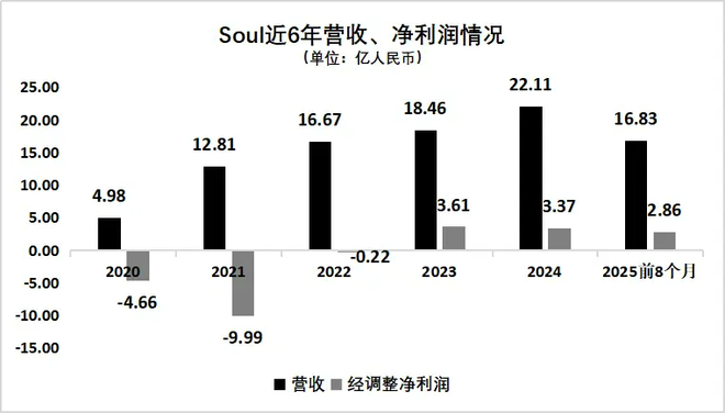 先看收入。Soul的总营收从2020年的4.98亿增长至2024年的22.11亿,2025年前8个月的营收更是达到16.83亿,较上年同期的14.28亿增长了17.86%。