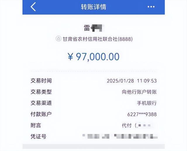 李先生给华商报大风新闻记者出示的一份转款凭证显示,当天上午他支付了97000元给一个姓雷的人,“那天我问张某红怎么把款转给他指定的个人账户呢,他说就是那个账户,还说办完手续支付完尾款就给房屋钥匙。”
