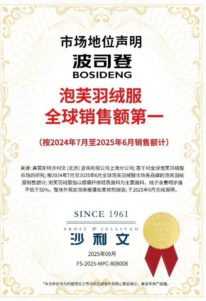 根据沙利文今年发布的报告,截至2025年6月底的过去一年,波司登作为产品的首创者,泡芙羽绒服全球销售额第一。