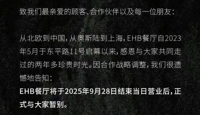 EHB餐厅在闭店公告中表示,此次“暂别并非终点”,未来期待以“全新形态”与大家再度相见。不过,截至发稿,官方尚未透露任何关于重启计划或经营策略调整的具体细节。
