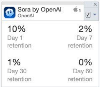 Olivia Moore晒出一张APP数据监测服务SensorTower的截图:Sora的30天用户留存率1%,60天用户留存率0%。