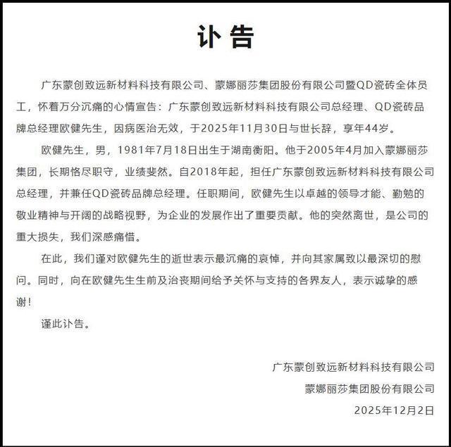 12月2日,广东蒙创致远新材料科技有限公司在其官方微信公众号发布讣告:广东蒙创致远新材料科技有限公司总经理、QD瓷砖品牌总经理欧健因病医治无效,于2025年11月30日去世,享年44岁。