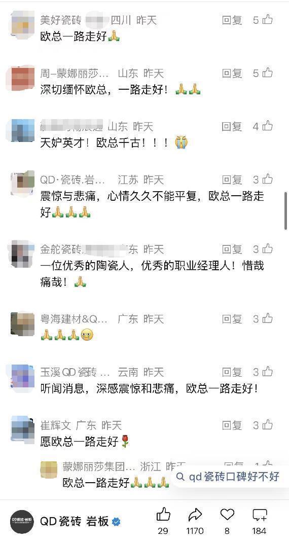 在讣告推文评论区下方有近两百条留言,这些同行或经销商等行业人士在评论区缅怀欧健。他们称,欧健是湖南老乡的骄傲,是一位优秀的陶瓷人,优秀的职业经理人,作为QD瓷砖的领航者,深耕行业、坚守品质,“欧总一路走好”。