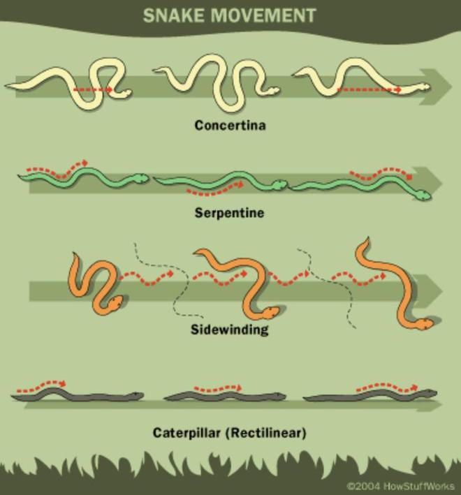 蛇的移动方式可以分为蜿蜒式、侧行式、直蠕式和风琴式,分别适用于不同的地面状况,这些方式总的来说都是为了在现有条件下最大程度增加摩擦力,来为运动提供充足的动力。