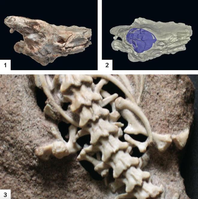 图1图2为Dinilysia patagonica的头骨,图3为保留后肢的蛇的骨骼|图源:Scientific American官网