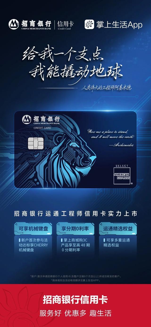近期,基于对国家“培育壮大新兴产业和未来产业”“前瞻布局未来产业”要求的响应,招行信用卡又在产品面积极创新。12月3日,推出招商银行运通工程师信用卡,为工程师这一代表先进生产力的人群提供更好的金融工具,增强服务覆盖与价值连接。在卡面设计中,招行信用卡别具匠心地融入了人类伟大工程师阿基米德的名言——“给我一个支点,我能撬动地球”,强化与客户的情感共鸣。为满足目标客群的需求,招行信用卡还在活动期内将机械键盘纳入新户礼选项,并推出持卡人专享权益:在掌上商城购买3C产品,可享最高48期0分期利率。