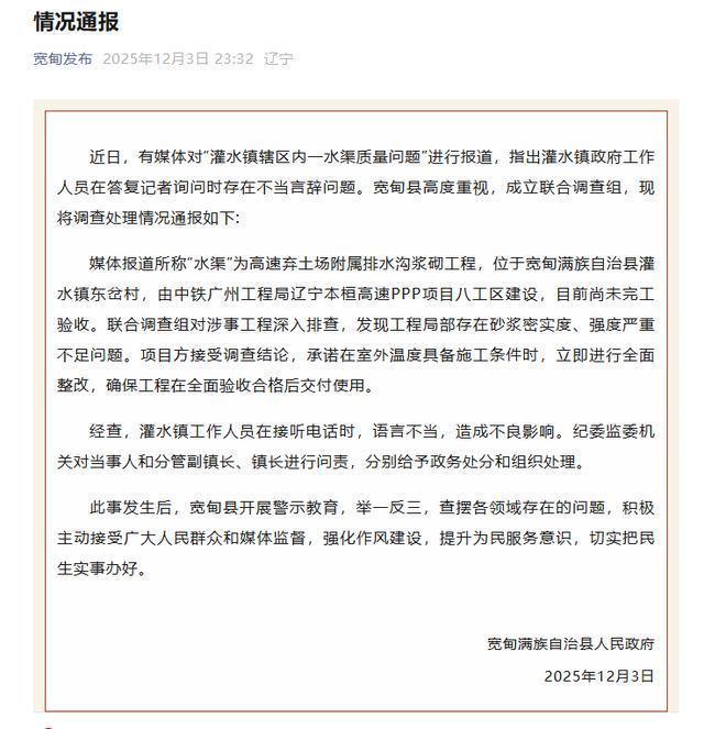 近日,有媒体对“灌水镇辖区内一水渠质量问题”进行报道,指出灌水镇政府工作人员在答复记者询问时存在不当言辞问题。宽甸县高度重视,成立联合调查组,现将调查处理情况通报如下: