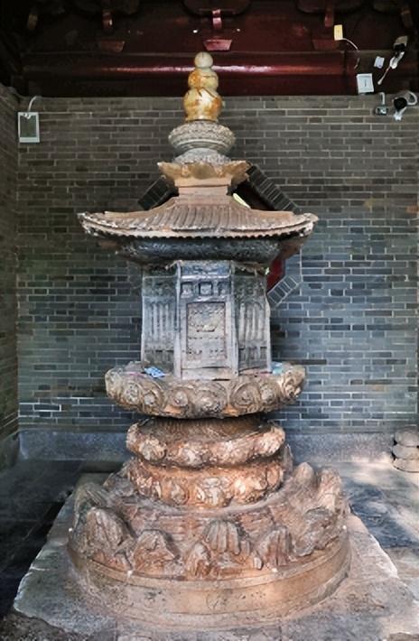在大雄宝殿西侧是“镇寺之宝”——鸠摩罗什舌舍利八宝玉石塔,通高2.46米,通体用灰、白、砖青、墨黑、乳黄、淡黄、浅蓝、赭紫八色大理石镶拼而成,堪称“中西合璧的艺术奇迹”。走近细观,塔身为单层亭阁式造型,北面自右而左,分上下两行雕刻塔名:“姚秦三藏法师鸠摩罗什舍利塔”,字迹虽有些模糊,却依旧能让人感受到岁月的厚重和玉石的温润。