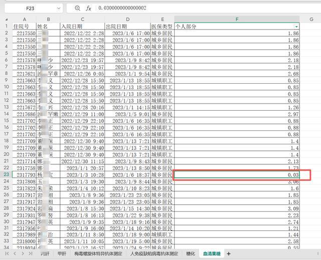 退费人员明细表显示,本次退费主要包括做过“丙肝”“甲肝”“梅毒螺旋体特异抗体测定”“人免疫缺陷病毒抗体测定”“糖化”“血清果糖”项目的患者。值得注意的是,该明细表直接写明了患者的姓名,其中退费金额最多为67.18元,最少的有0.03元。