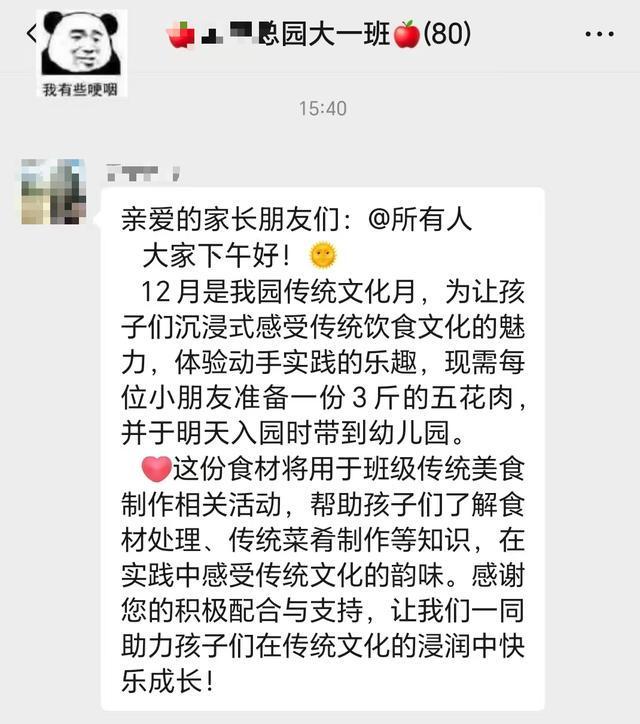 该网友发布的群聊截图显示,幼儿园老师称,12月是该园传统文化月,为让孩子们沉浸式感受传统饮食文化的魅力,体验动手实践的乐趣,现需每位小朋友准备一份3斤的五花肉,于明天入园时带到幼儿园。这份食材将用于班级传统美食制作相关活动,帮助孩子们了解食材处理、传统菜肴制作等知识,在实践中感受传统文化的韵味。