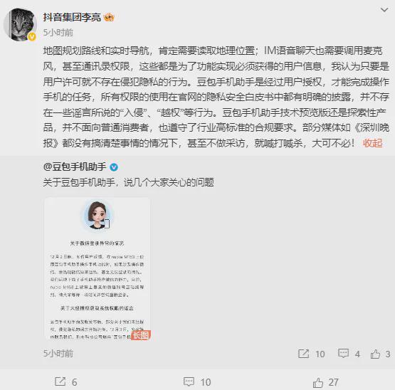 随后,抖音高管李亮深夜再发微博明确,豆包 AI 助手的跨应用任务执行均以用户授权为前提,所有权限的使用规则已在官网《隐私安全白皮书》中明确披露。