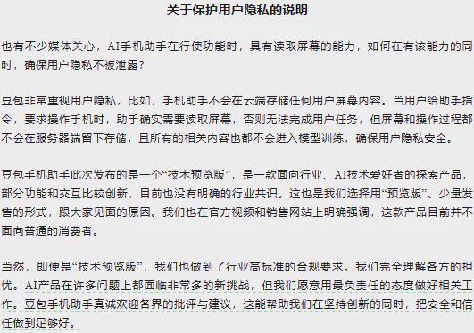 二是,针对“豆包 AI 助手侵犯用户隐私”的质疑,豆包方面回应称,AI 助手读取屏幕内容时,不会在云端存储任何相关数据,且所有屏幕信息均不会用于模型训练;此外,AI 助手执行长时任务时,屏幕会出现明确提示,用户可随时中断操作,全程具备可控性。