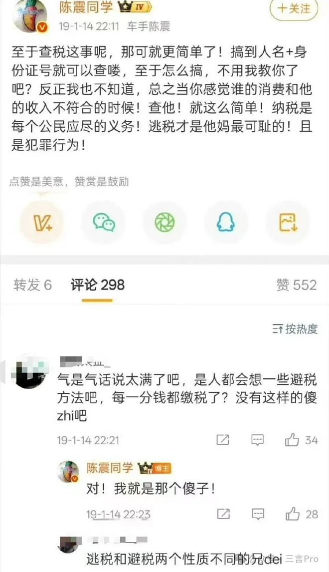 而在2019年,陈震曾发微博称“纳税是每个公民应尽的义务,逃税才是他妈最可耻的”: